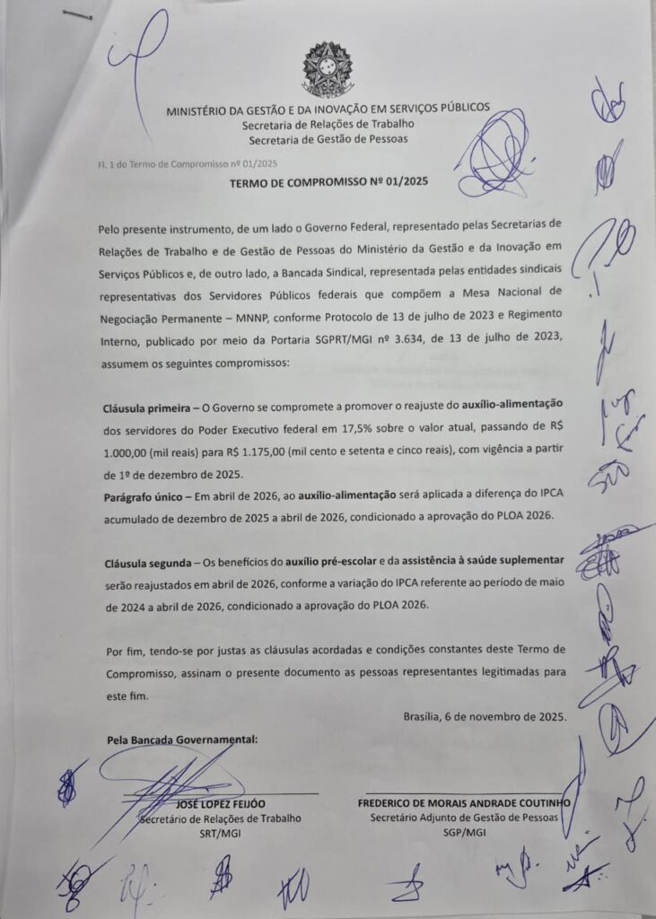 O acordo, resultado das tratativas realizadas no âmbito da Mesa Nacional de Negociação Permanente (MNNP), contempla reajustes nos valores do auxílio-alimentação, auxílio-creche e assistência à saúde suplementar, demandas que vinham sendo discutidas com o governo federal.
