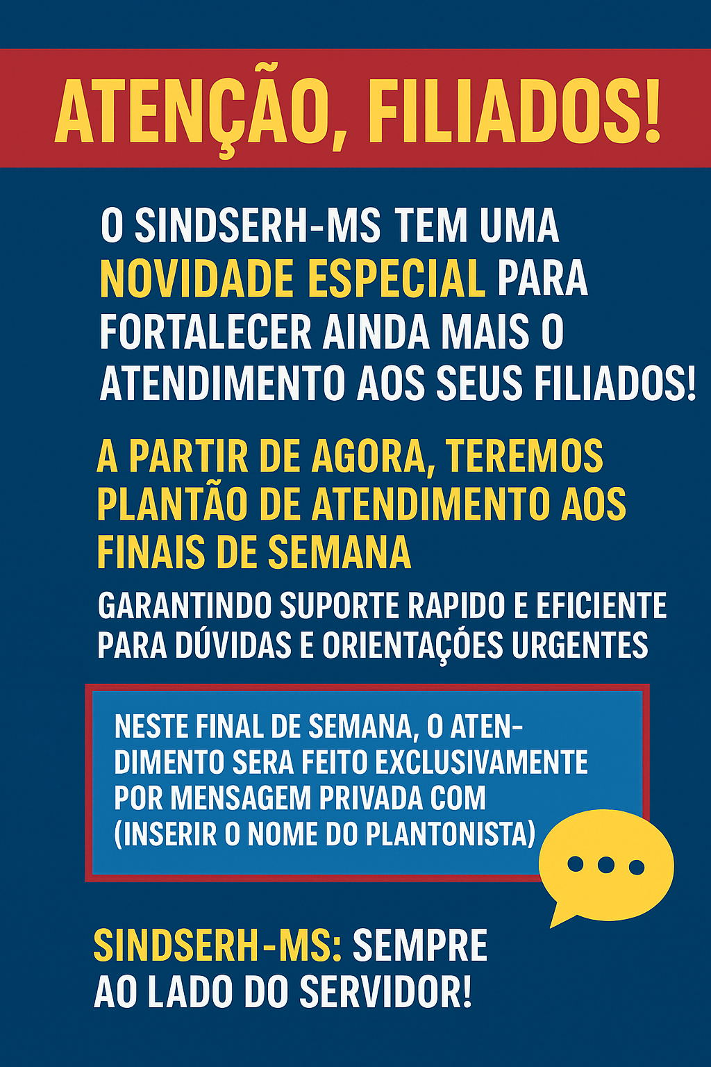 Pensando em oferecer um atendimento cada vez mais próximo e eficiente, o SINDSERH-MS passa a contar, a partir de agora, com plantão de atendimento aos finais de semana. 💪