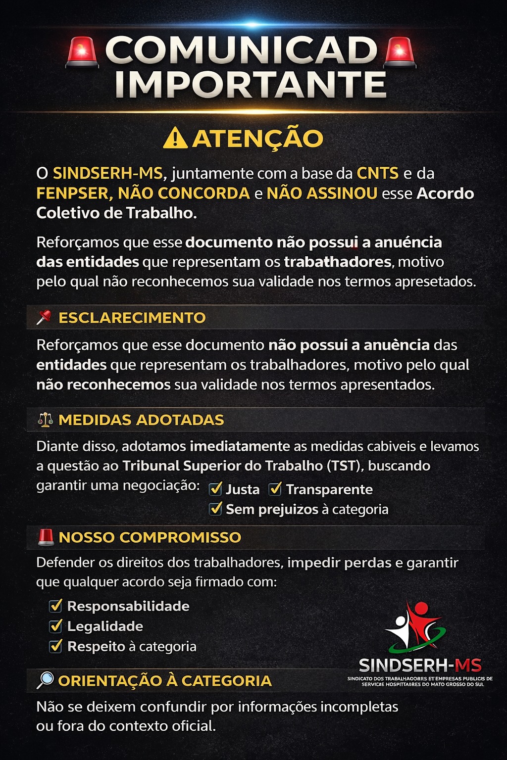 Diante disso, adotamos imediatamente as medidas cabíveis e levamos a questão ao Tribunal Superior do Trabalho (TST), buscando garantir uma negociação justa, transparente e que preserve integralmente todos os direitos da categoria, sem qualquer tipo de prejuízo.