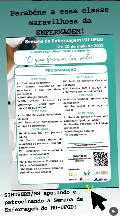 Que legal! O SINDSERH/MS apoiando a Semana da Enfermagem do HU-UFGD é uma excelente iniciativa para valorizar ainda mais o trabalho dos profissionais da enfermagem, que desempenham um papel fundamental na saúde de todos. É sempre importante reconhecer a dedicação e o esforço dessa categoria, especialmente com tantas demandas e desafios diários. Você está participando das atividades dessa semana?.